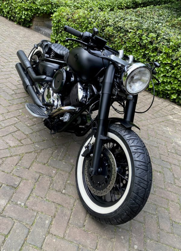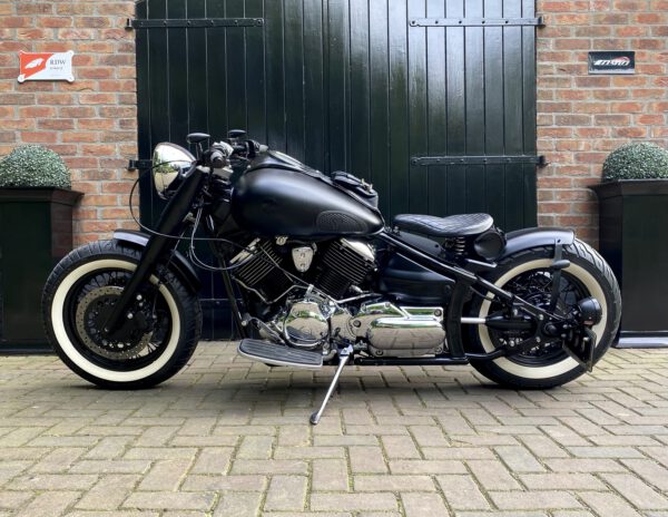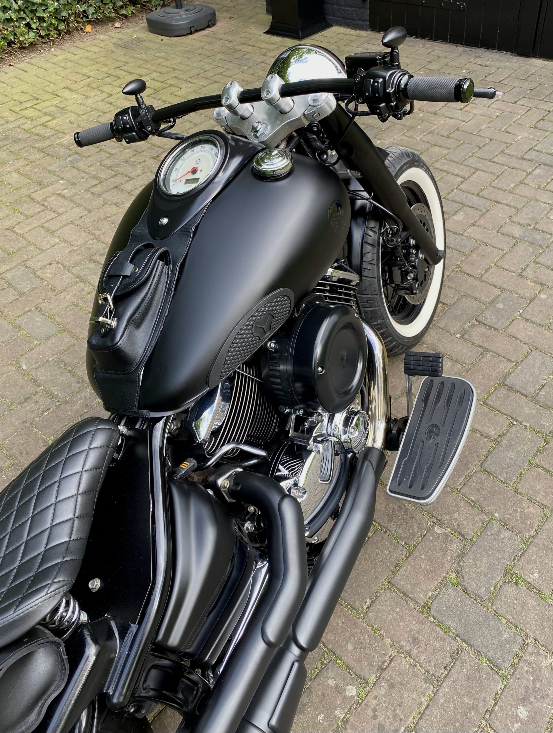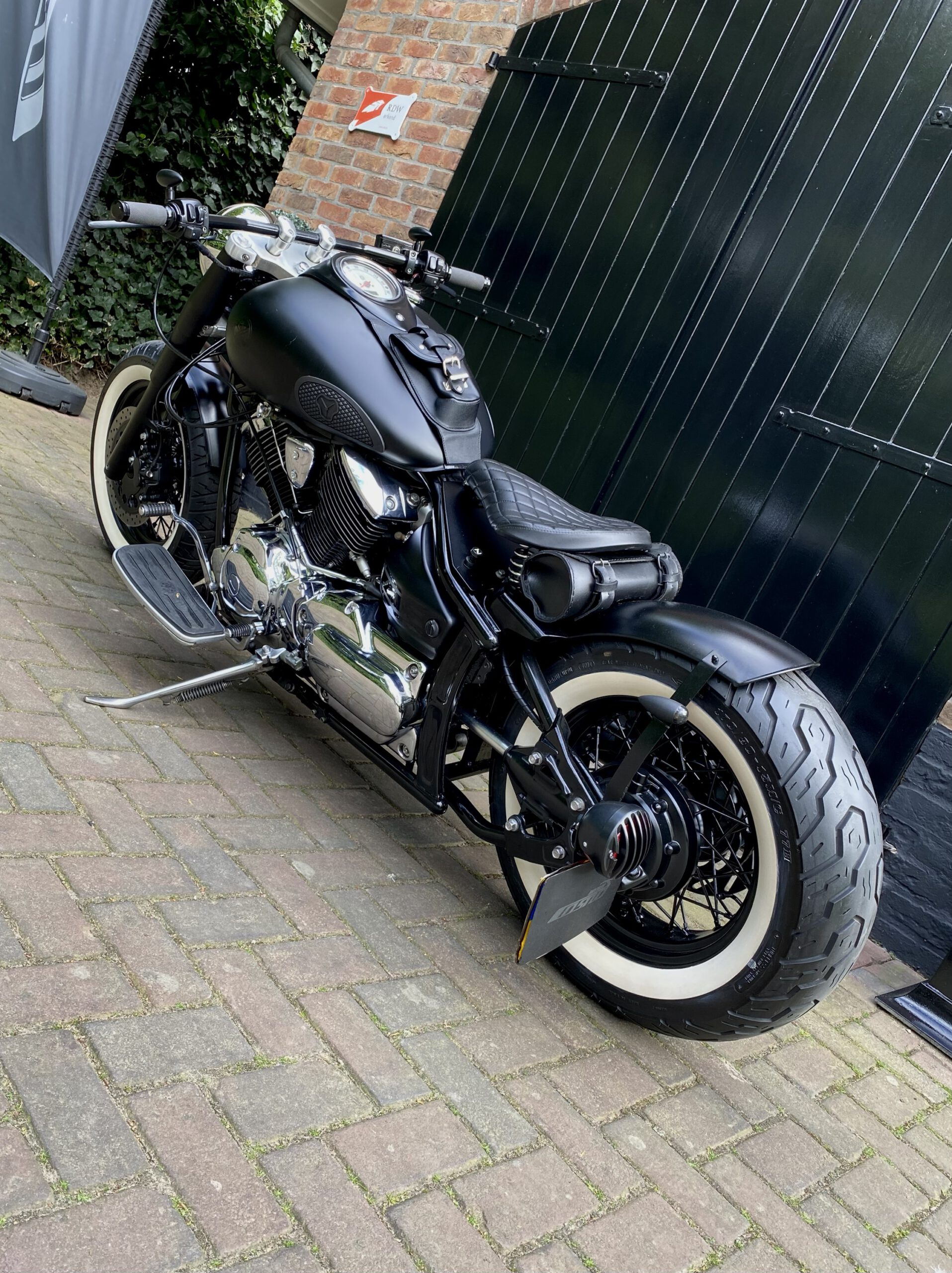 Dikke Dragstar welke geheel is omgebouwd tot bobber, het betreft een Classic uitvoering dus met breed voorwiel, dikke voorvork en grote koplamp. Uitgevoerd in donkerbruin Satin met gecombineerd met zwarte velgen en onderdelen, waardoor de motor een gave retro uitstraling heeft gekregen!