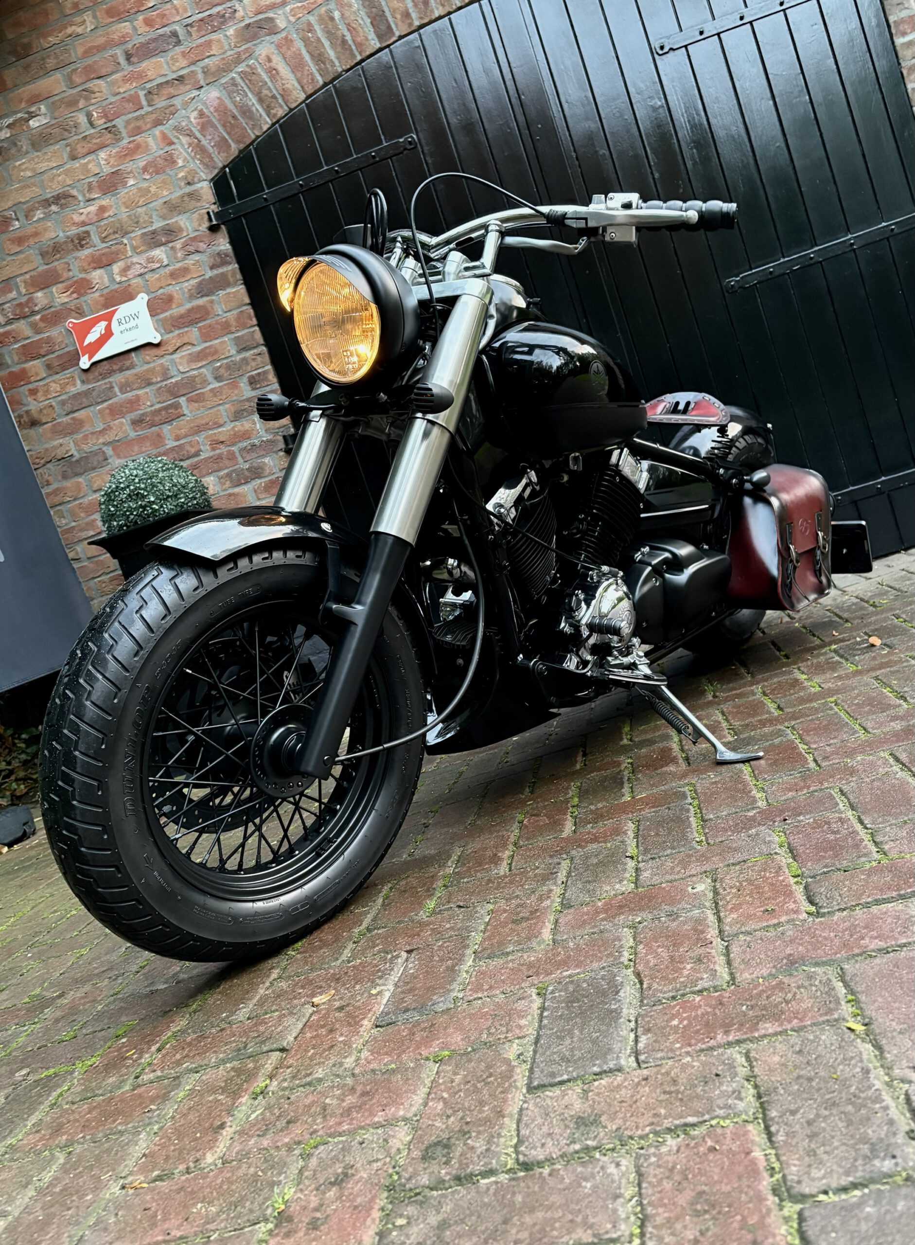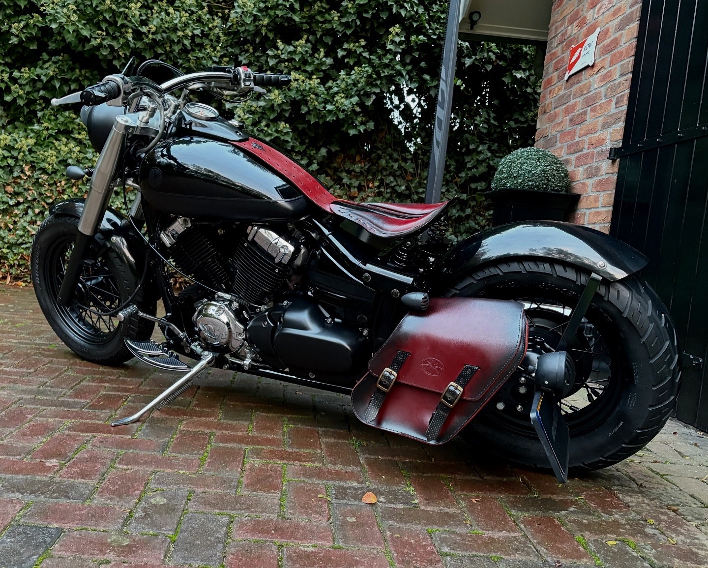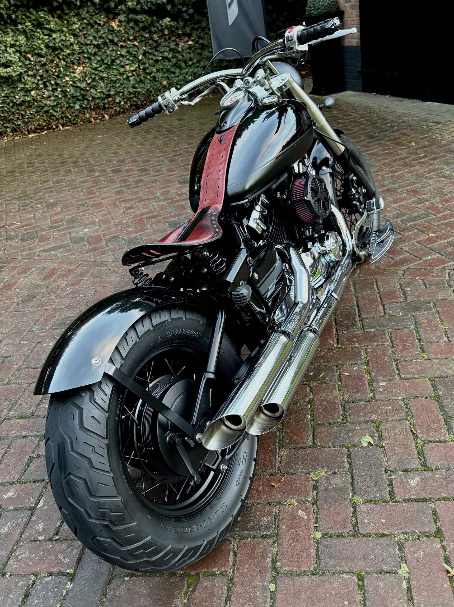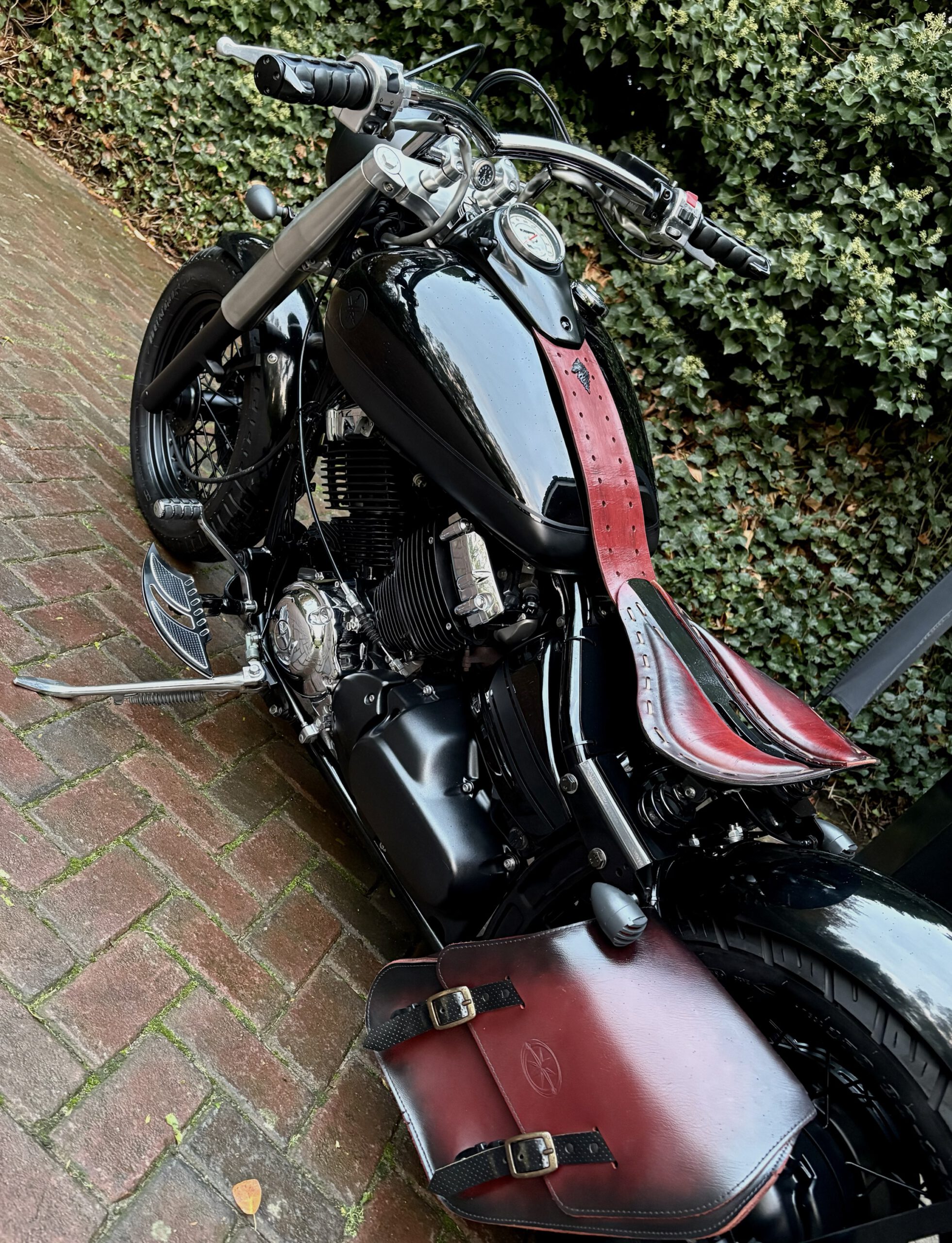 Zeer mooie Dragstar welke stijlvol is omgebouwd tot bobber, uitgevoerd in hoogglans zwart gecombineerd met matzwart en mooie lederen accessoires. Voorzien van complete professionele Bobbercycle ombouwset.