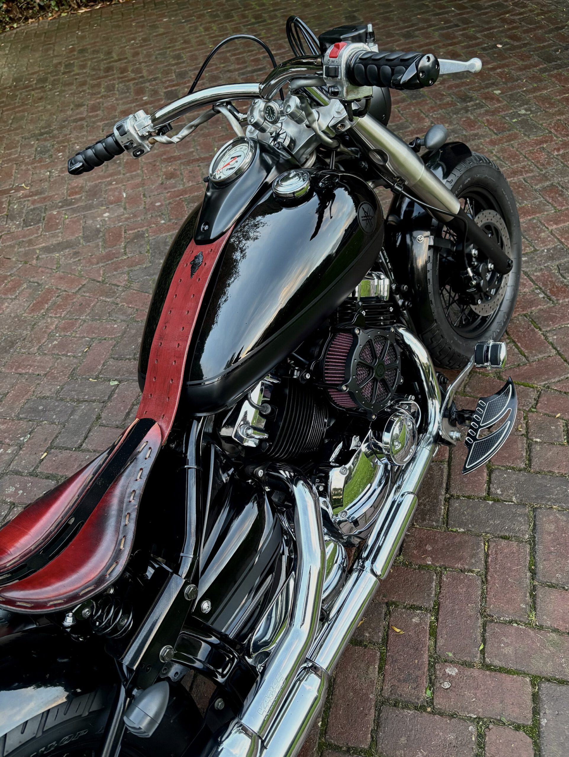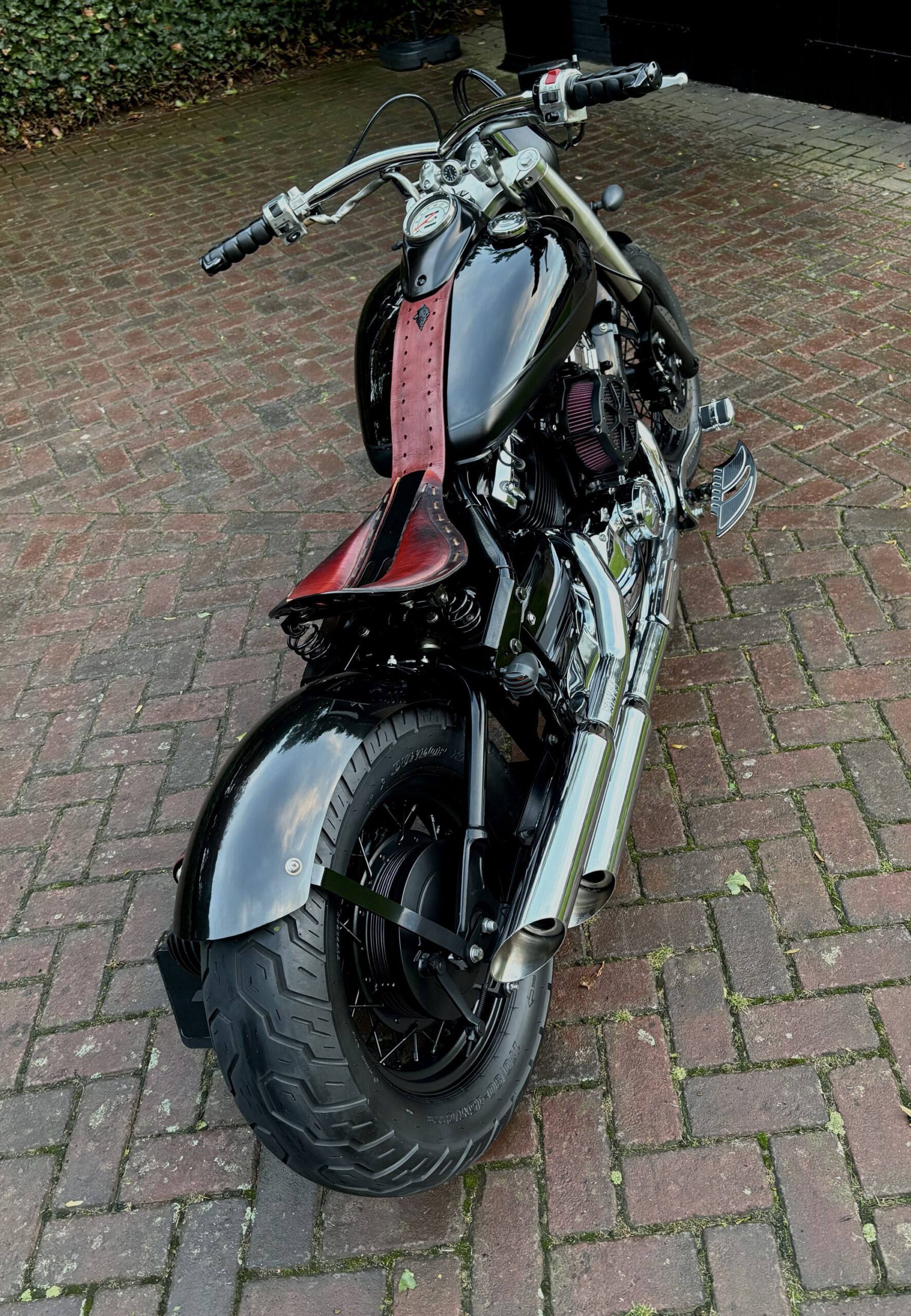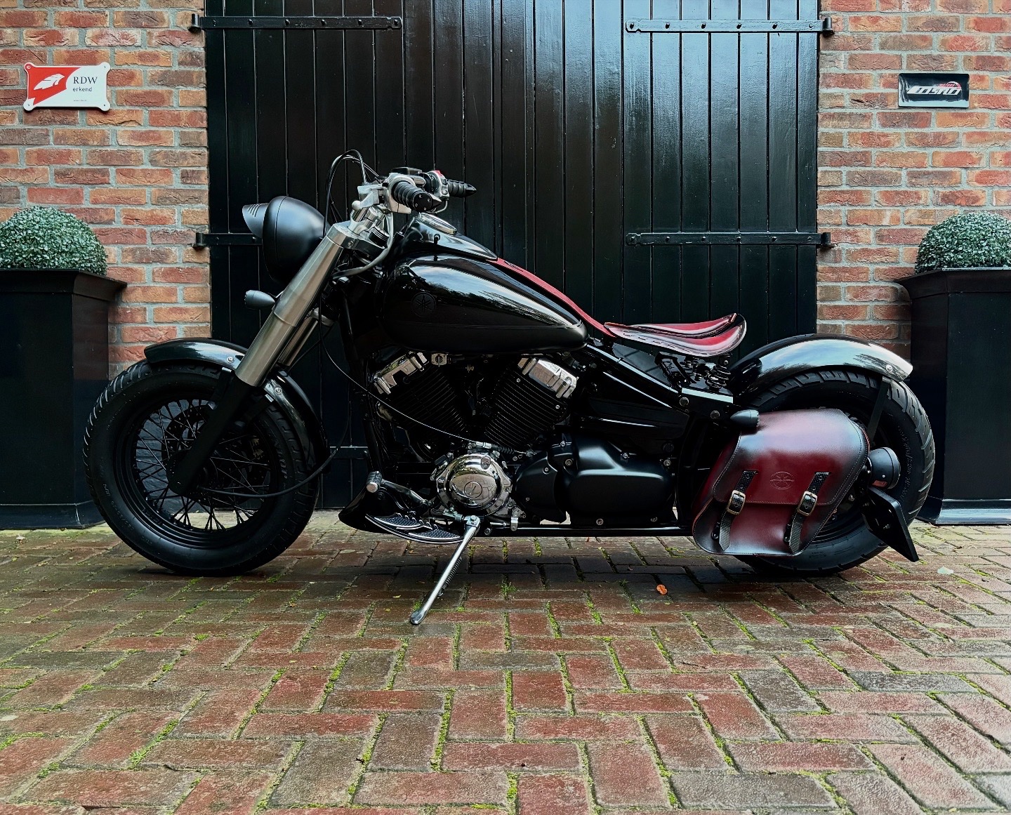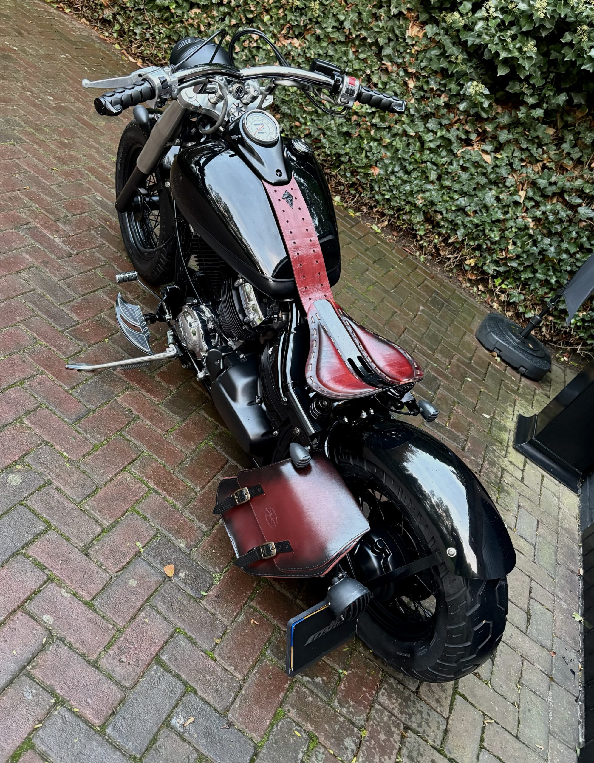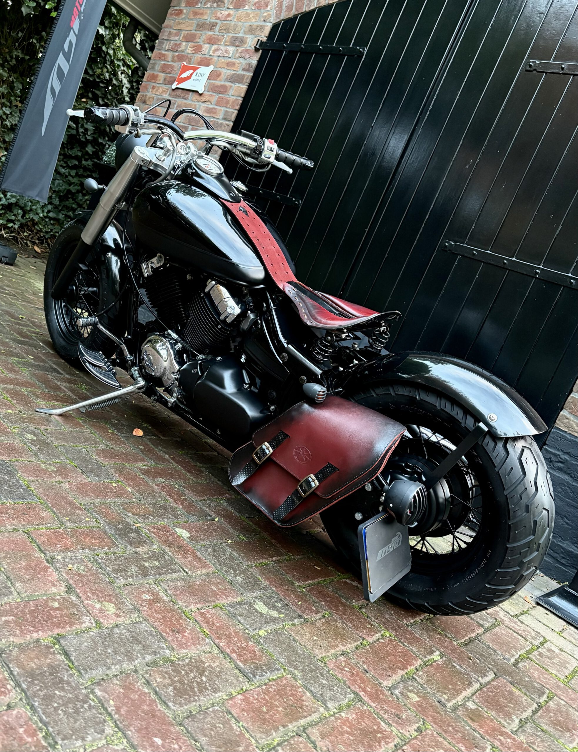 Zeer mooie Dragstar welke stijlvol is omgebouwd tot bobber, uitgevoerd in hoogglans zwart gecombineerd met matzwart en mooie lederen accessoires. Voorzien van complete professionele Bobbercycle ombouwset.