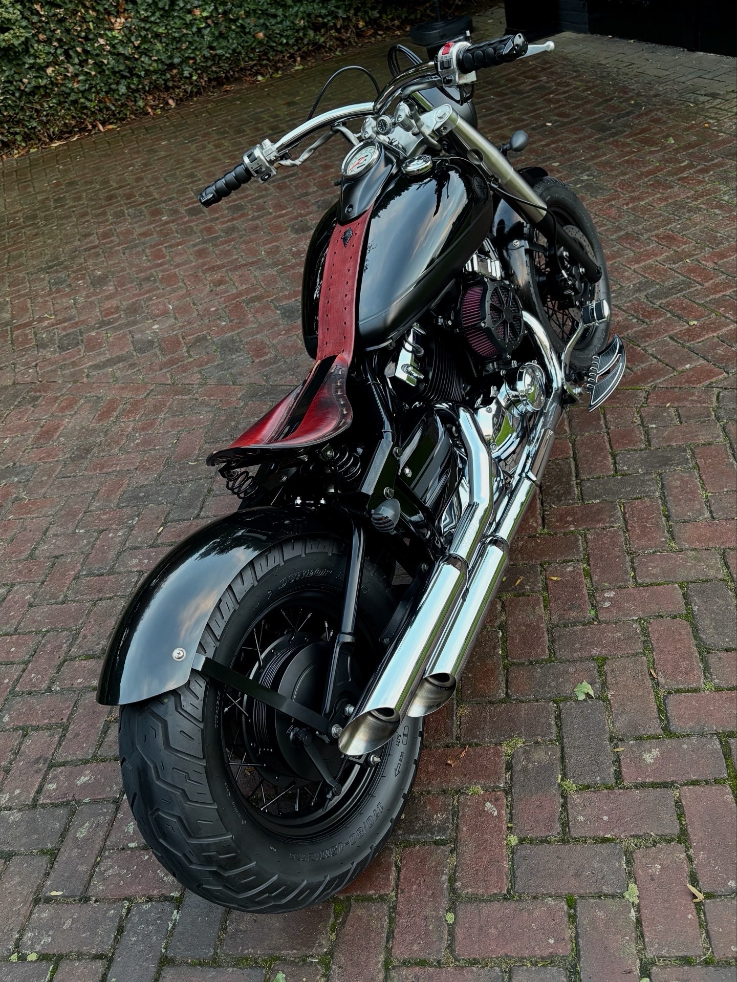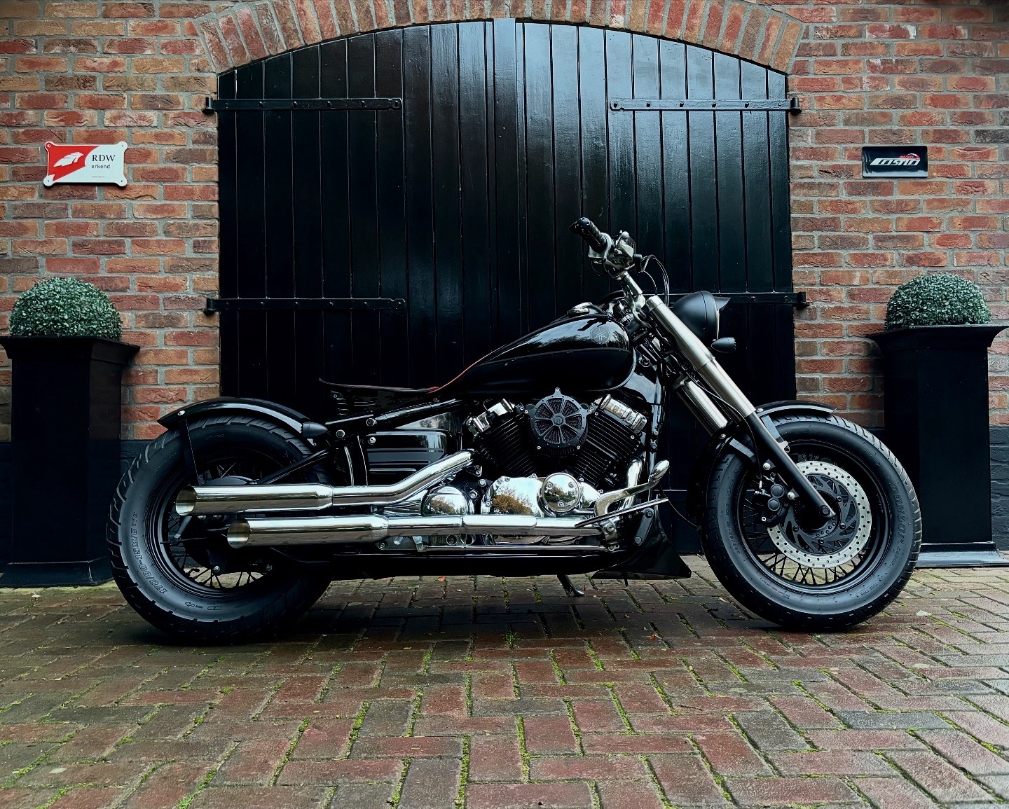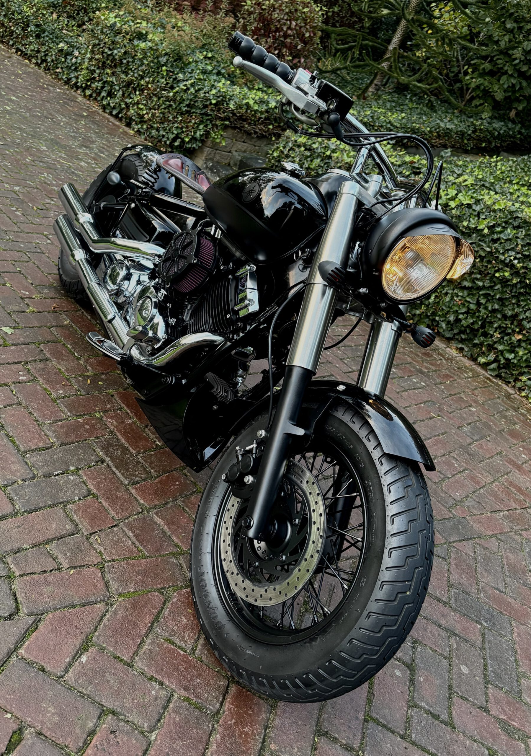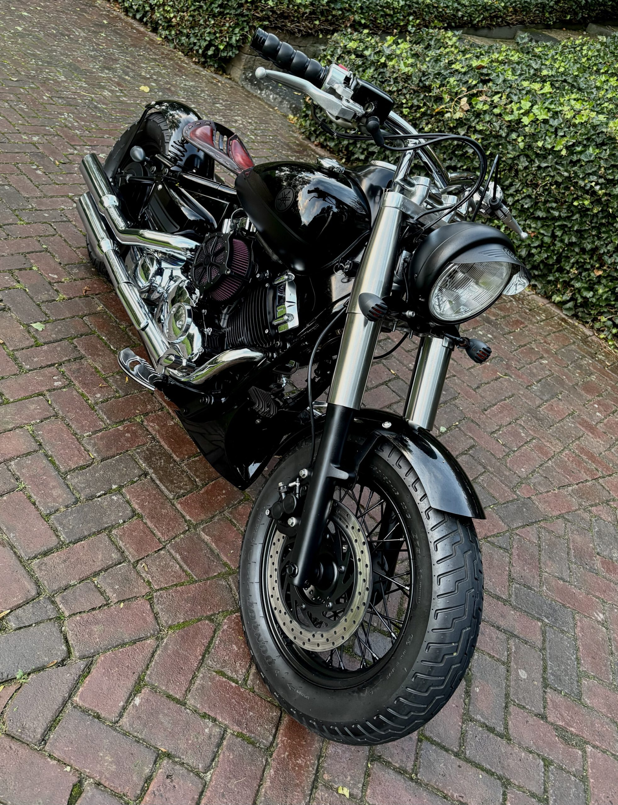 Zeer mooie Dragstar welke stijlvol is omgebouwd tot bobber, uitgevoerd in hoogglans zwart gecombineerd met matzwart en mooie lederen accessoires. Voorzien van complete professionele Bobbercycle ombouwset.