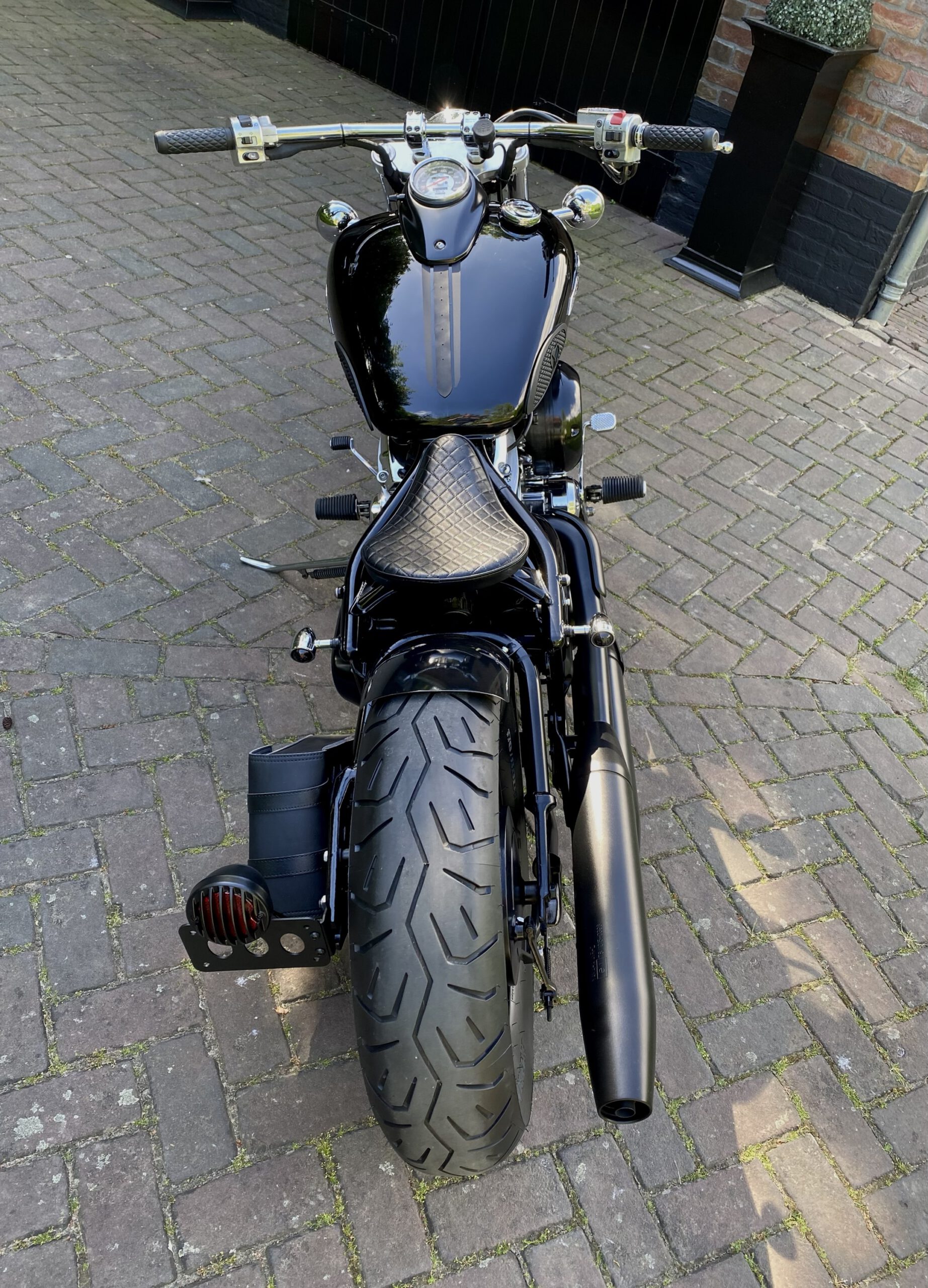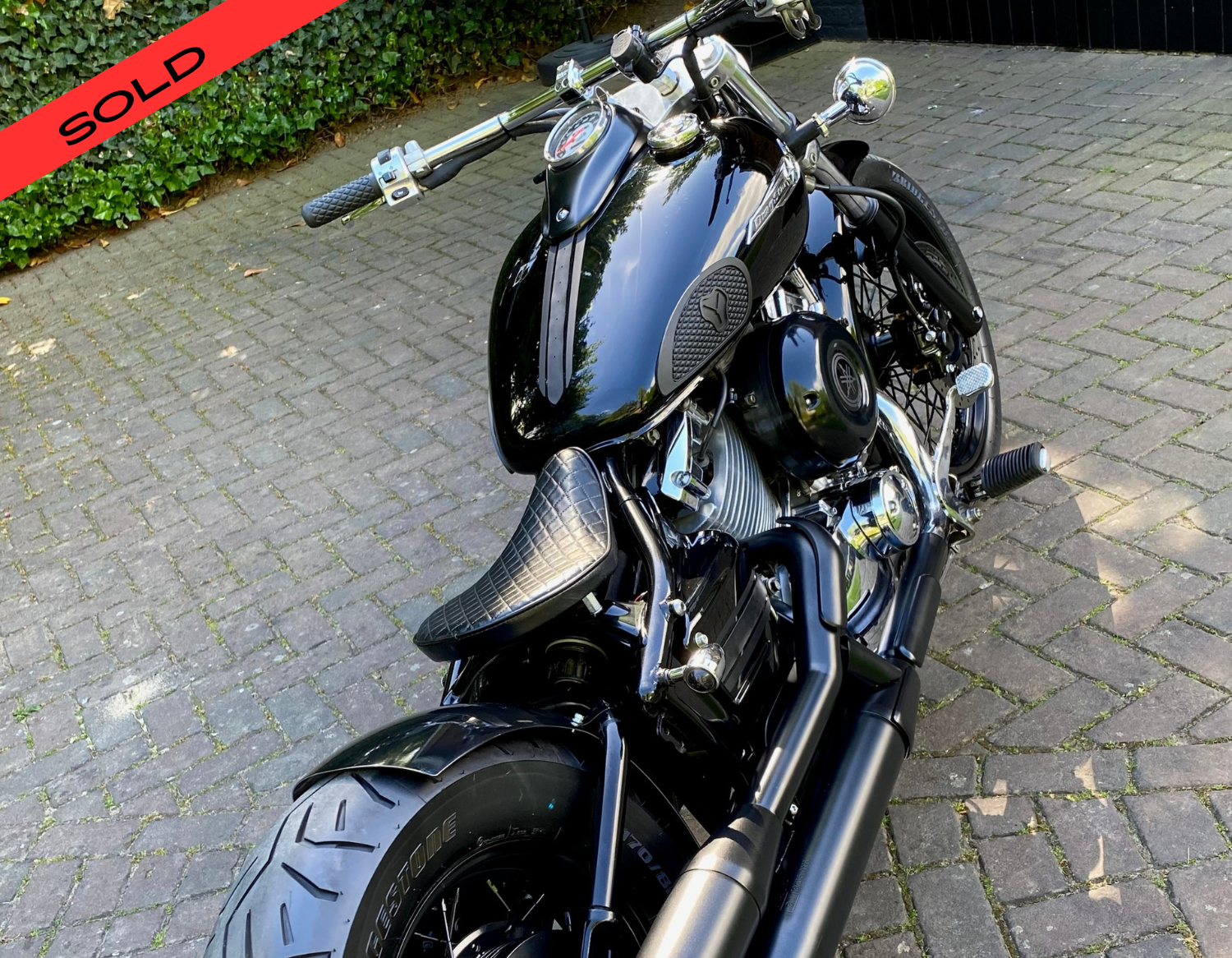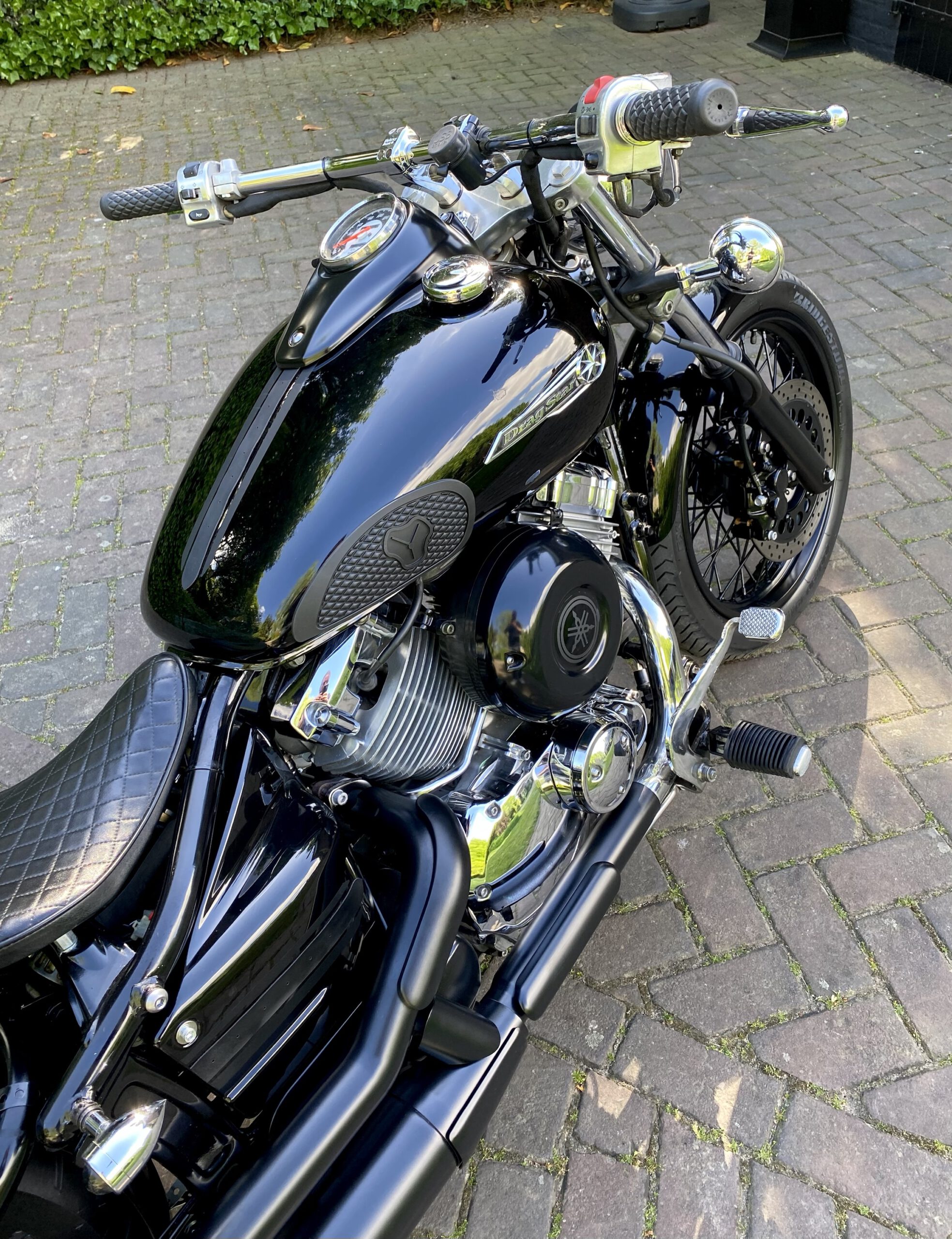 Supergave Dragstar welke geheel is omgebouwd tot bobber, uitgevoerd in full black.